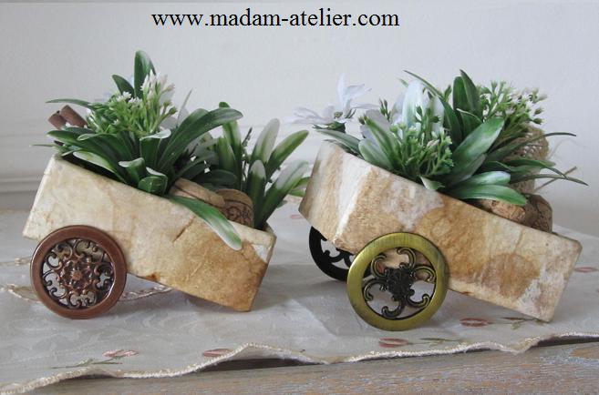 A partir da técnica usada na papietagem, cortei a caixa de leite e contruí a base para minha pequena carroça vintage com a ajuda de fita crepe.  Para as rodinhas, usei puxadores de ferro no estilo antigo. Colei filtros de café usados e fiz o acabamento com verniz fosco.